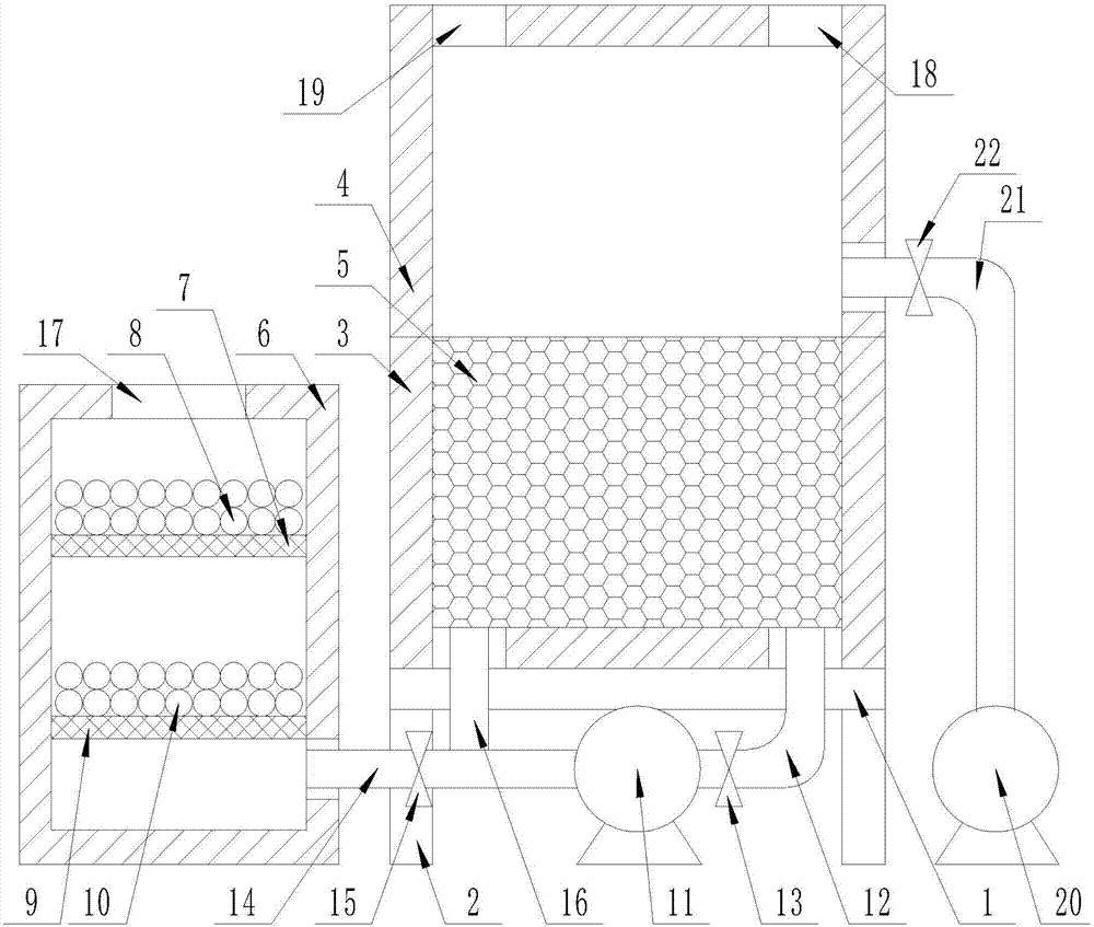 在本實(shí)施方案中,在設(shè)備空閑處設(shè)有HB104控制器,控制器的輸出端與一號電磁閥13、二號電磁閥15、三號電磁閥22、一號引風(fēng)機(jī)11、二號引風(fēng)機(jī)20的輸入端均通過導(dǎo)線相連接,將設(shè)備連接電源,通過控制控制器控制二號電磁閥15、一號引風(fēng)機(jī)11打開,一號電磁閥13、三號電磁閥22、二號引風(fēng)機(jī)20關(guān)閉,從廢氣廢氣進(jìn)氣口17進(jìn)入矩形箱體6,經(jīng)過一號網(wǎng)格擋板7上的脫氮?jiǎng)?祛除廢氣中的氮,經(jīng)過二號網(wǎng)格擋板9上的脫硫劑10祛除廢氣中的硫;脫硫劑10、脫氮?jiǎng)?能夠與化肥廠合作提取合成化肥,利用率提高;在一號引風(fēng)機(jī)11的作用下通過二號管道14、三號管道16進(jìn)入U(xiǎn)形槽3,經(jīng)過陶瓷蓄熱體5進(jìn)入到倒U形槽4,倒U形槽4內(nèi)通過燃料入口18加入燃料,通過進(jìn)風(fēng)口19加入氧氣,將廢氣加熱到700-900攝氏度使廢氣中的VOC在氧化分解成二氧化碳和水,氧化產(chǎn)生的高溫氣體流經(jīng)特制的陶瓷蓄熱體5,使陶瓷蓄熱體5升溫而“蓄熱”,此“蓄熱”用于預(yù)熱后續(xù)進(jìn)入的有機(jī)廢氣,從而節(jié)省廢氣升溫的燃料消耗,可以控制三號電磁閥22、二號引風(fēng)機(jī)20的開關(guān)控制廢氣處理時(shí)間,達(dá)到時(shí)間后打開三號電磁閥22、二號引風(fēng)機(jī)20,在二號引風(fēng)機(jī)20的作用下將處理后的廢氣排出;也可以控制一號電磁閥13、一號引風(fēng)機(jī)11打開,二號電磁閥15、三號電磁閥22關(guān)閉,將廢氣循環(huán)引入U(xiǎn)形槽3、倒U形槽4內(nèi),可循環(huán)處理,多次處理后廢氣分解效率達(dá)到99%以上,節(jié)約空間、節(jié)省投資費(fèi)用。